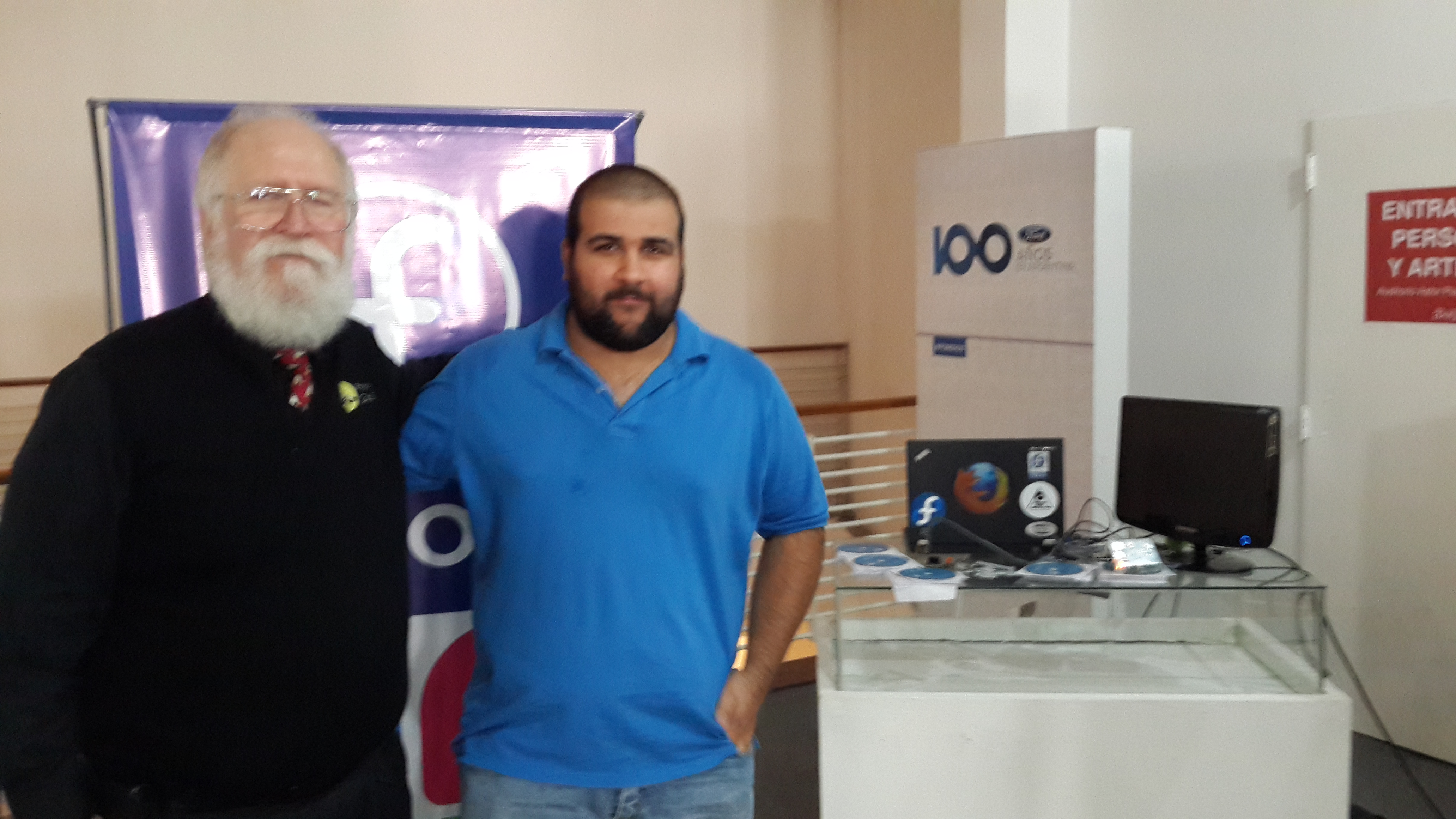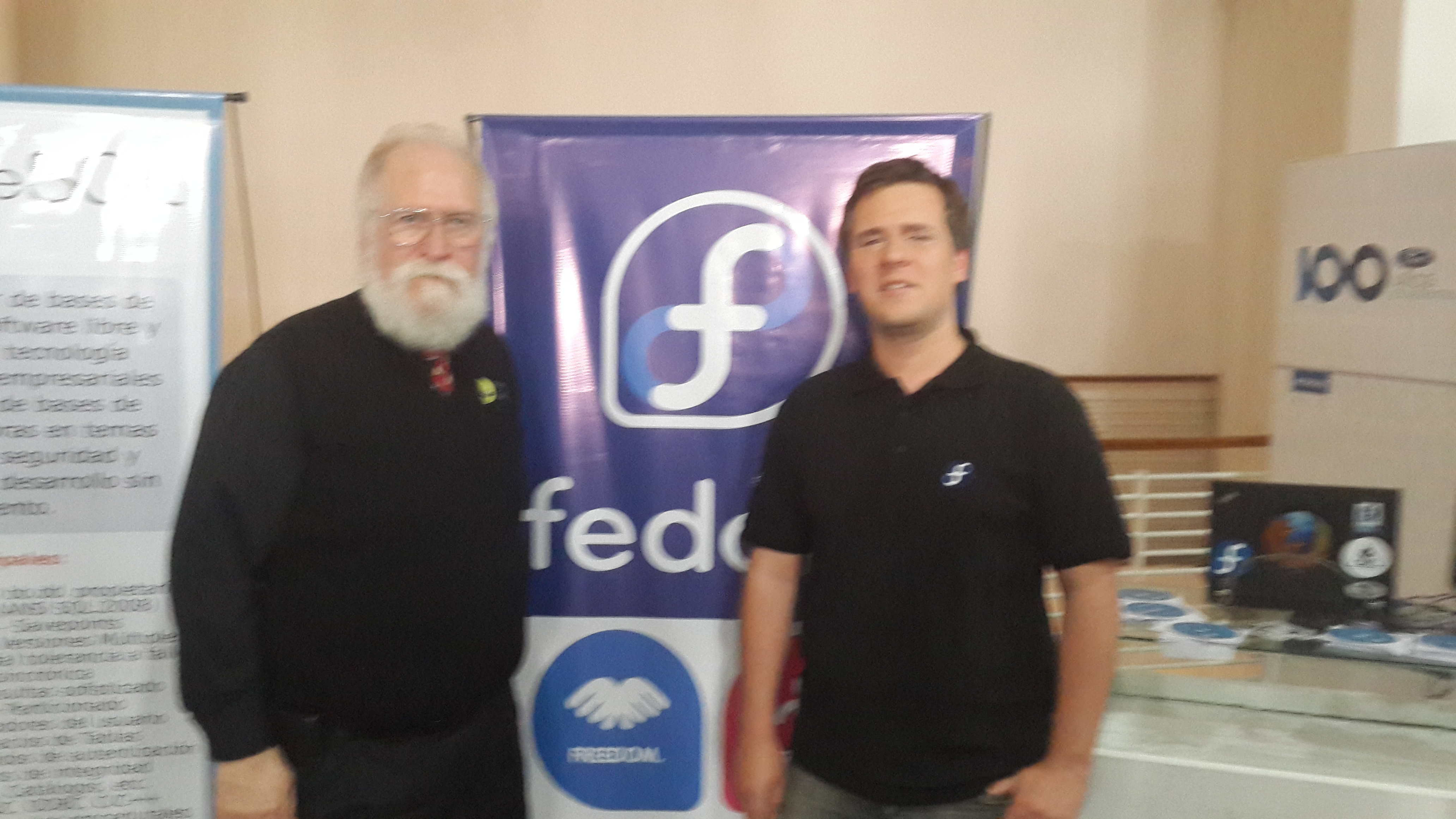 También tuve la oportunidad de conocer a Jon "maddog" Hall, director de Linux International. Nos tomamos una foto juntos y después me contó de la iniciativa de traducir código ensamblador a C o código ensamblador compatible con ARMv8+ (aarch64).